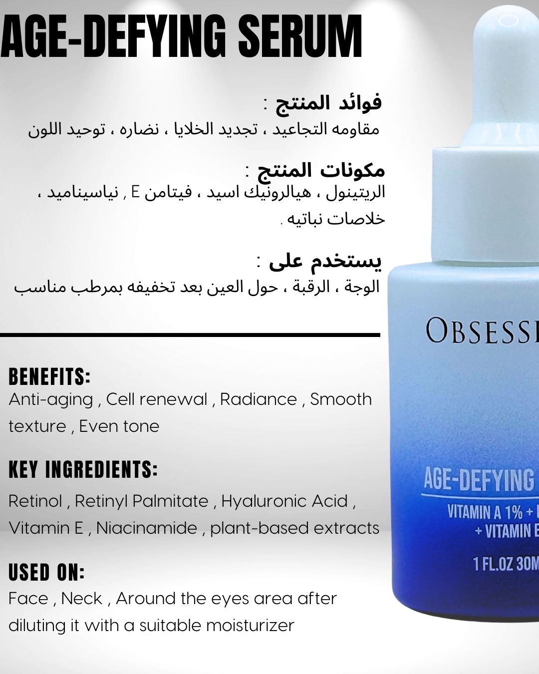 We are pleased to introduce OBSESSION Face Serum, specially designed to combat signs of aging and improve the appearance of the skin. This serum contains advanced and effective ingredients that work in harmony to achieve maximum benefits for your skin. Embark on a journey of youth renewal with this unique formula which includes: