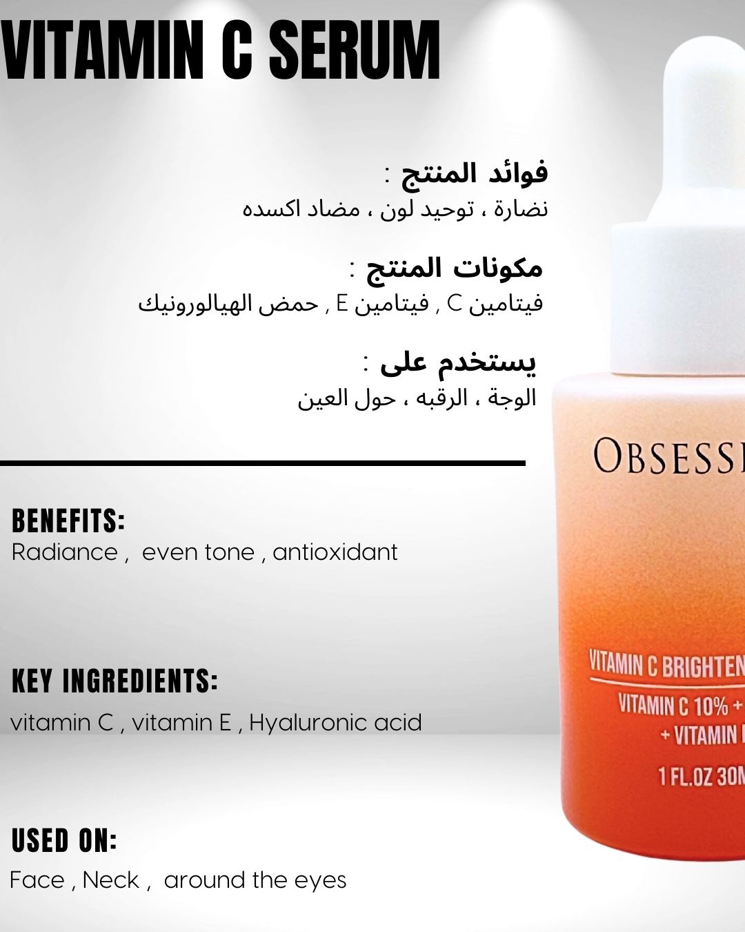 We are glad to introduce the Vitamin C Brightening Serum by OBSESSION, specially designed to brighten and revitalize the skin, thanks to its innovative formula that combines the following active elements: